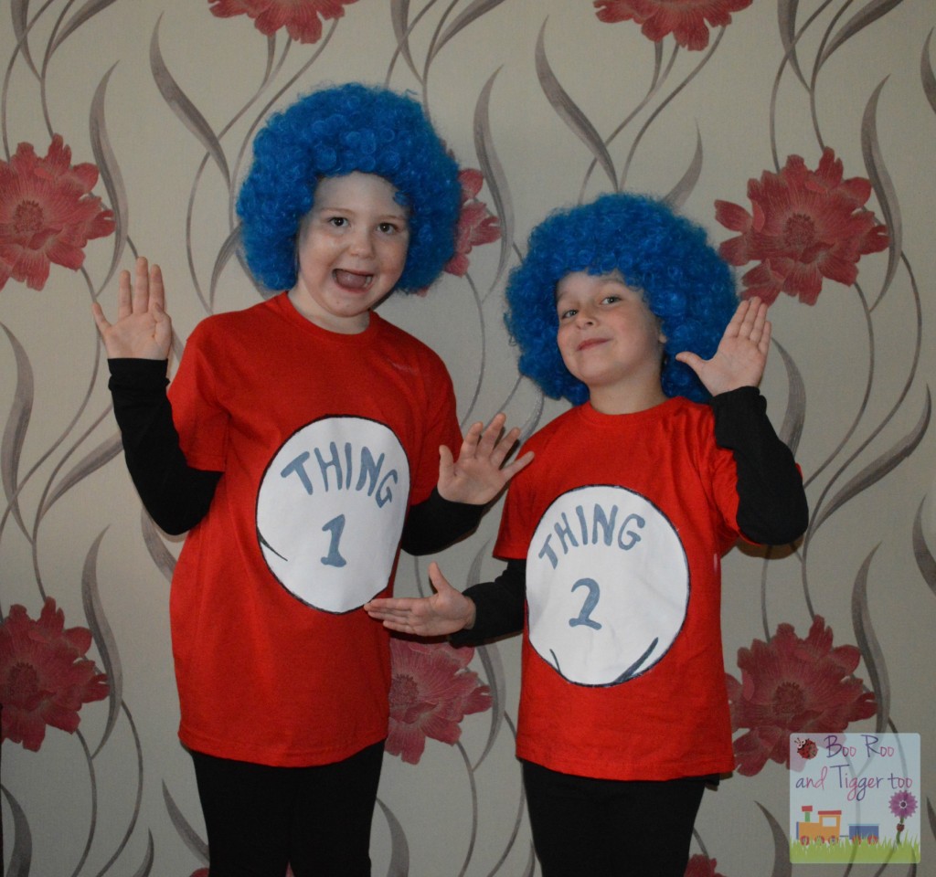 Blue beanie hats and a single feather boa, hot glued on in pieces. Baby thing 1 & 2 costume includes a red jumpsuit with an attached blue hood and 2 patches. Seuss costume | officially licensed.